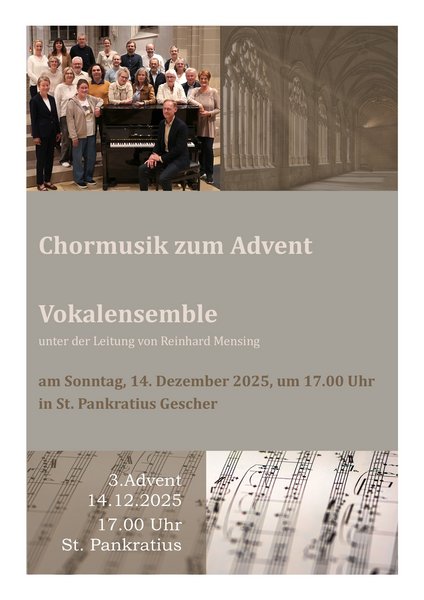 Das Vokalensemble unter der Leitung von Reinhard Mensing gestaltet am 14. Dezember um 17.00 Uhr eine Kirchenmusikalische Andacht in St. Pankratius, Gescher. Barocke Klänge von Vincent Lübeck, Werke der Romantik von Max Reger und Maurice Durufle sowie Alan Wilson laden zum zuhören und Adventslieder zum mitsingen ein.