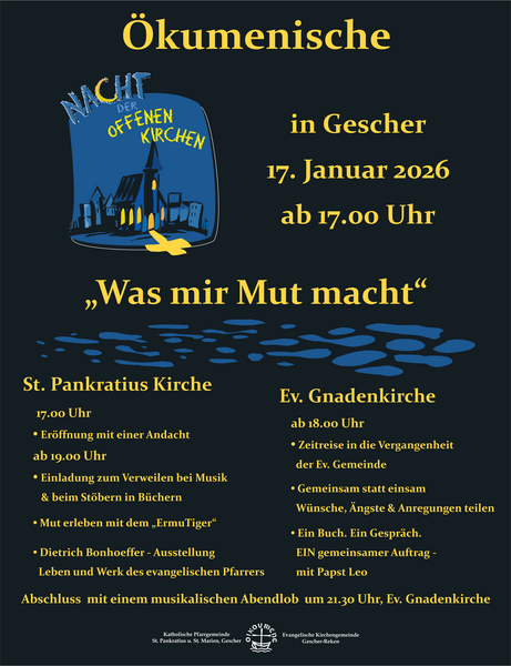 Zu einer ökumenischen Nacht der offenen Kirchen laden die evangelische und katholische Gemeinde in Gescher heute herzlich ein. Beginn und Eröffnung ist um 17 Uhr in der St. Pankratius-Kirche mit einem kurzen Impuls. In der Pankratius-Kirche wird eine Ausstellung mit Bildern von Dietrich Bonhoeffer zu sehen sein, eine geistliche Leseecke lädt zur Auszeit ein. Die ev. Gnadenkirche lädt mit besonderer Beleuchtung und Musik in der Zeit bis 21.30 Uhr zu verschiedenen Angeboten ein, danach ist ein gemeinsamer Abschluss in der ev. Gnadenkirche.