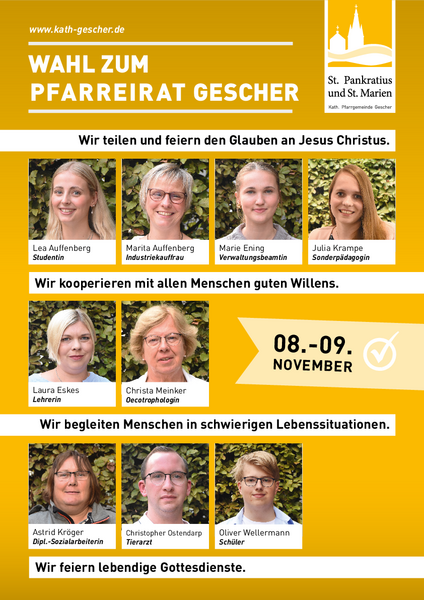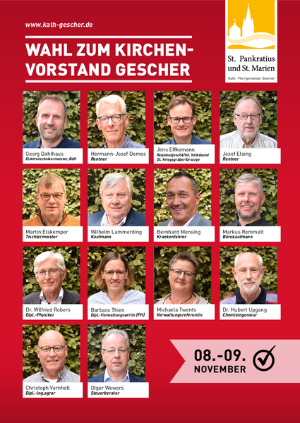 am 08./09. November werden Pfarreirat und Kirchenvorstand neu gewählt. Beide Gremien helfen maßgeblich dabei, dass Kirche vor Ort funktioniert. Der Pfarreirat setzt gemeinsam mit den Seelsorgern die pastoralen Leitlinien für unsere Gemeinde. Der Kirchenvorstand bringt seine Expertise bei der Vermögens- und Personalverwaltung ein. Außerdem geben die Mitglieder beider Gremien unserer Pfarrgemeinde St. Pankratius und St. Marien ein Gesicht in der Öffentlichkeit. Daher bin ich allen Kandidaten sehr dankbar für ihr ehrenamtliches Engagement!