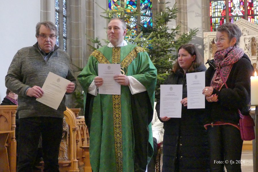 Mit Schreiben vom 17.12.2025 hat Diözesanadministrator Antonius Hamers das Leitungsteam des Pastoralen Raumes Gescher-Velen-Reken ernannt. Am Sonntag wurden dem Gremium, dem ehrenamtlich Barbara Richter-Hoffschlag aus Velen und Egbert Kock aus Gescher sowie Lena Glenz Reken) aus dem Kreis der Pastoralreferenten und -referentinnen sowie Pastor Hendrik Wenning aus dem Kreis der leitenden Pfarrer während des Gottesdienstes in der Pfarrkirche St. Pankratius in Gescher die entsprechenden Urkunden überreicht.Sobald der Pastorale Raum einen Verwaltungsleiter erhält, ist auch dieser „geborenes Mitglied“ des Leitungsteams, wie Pfr Wenning erläutert. Laut Diözesanadministrator Hamers obliegt dem Leitungsteam die Verantwortung für die Seelsorge auf der Ebene des Pastoralen Raumes, während den drei Pfarreien ihre eigenständigkeit und ihre Verantwortung vor Ort erhalten bleiben. Das Miteinander soll durch ein kooperatives Verhältnis, die Freiwilligkeit der Akteure, offenheit für Entwicklung und einen konstruktiven Gestaltungswillen gekennzeichnet sein. Im Zentrum der neuen Struktur steht die Verkündigung des Glaubens unter künftig deutlich veränderten Rahmenbedingungen.